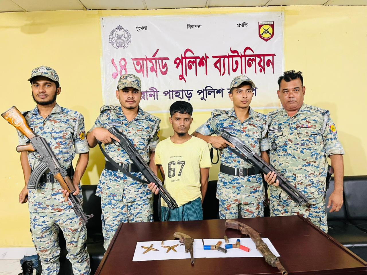 গত বৃহস্পতিবার (২৬ সেপ্টেম্বর) রাত সাড়ে ১১টার দিকে গোপন তথ্যের ভিত্তিতে ১৪ এপিবিএন অধিনায়ক( অতিরিক্ত ডিআইজি) মোহাম্মদ সিরাজ আমীনের নির্দেশনায় ইরানি পাহাড় পুলিশ ক্যাম্পের ক্যাম্প ইনচার্জ আবুল কালাম আজাদের নেতৃত্বে একটি বিশেষ অভিযান পরিচালিত হয়। অভিযানটি পরিচালনা করেন এসআই কায়েমুল ইসলাম, এএসআই শাহাবুদ্দিনসহ সঙ্গীয় ফোর্স। এসময় ১টি ওয়ান শুটার গান, ১টি এলজি গান এবং ১৬ রাউন্ড গুলিসহ ক্যাম্প-৮ ওয়েস্টের মোহাম্মদ হোসেনের ছেলে আনোয়ার সাদেক(২০) কে নিজ বসতঘর থেকে গ্রেফতার করা হয়।