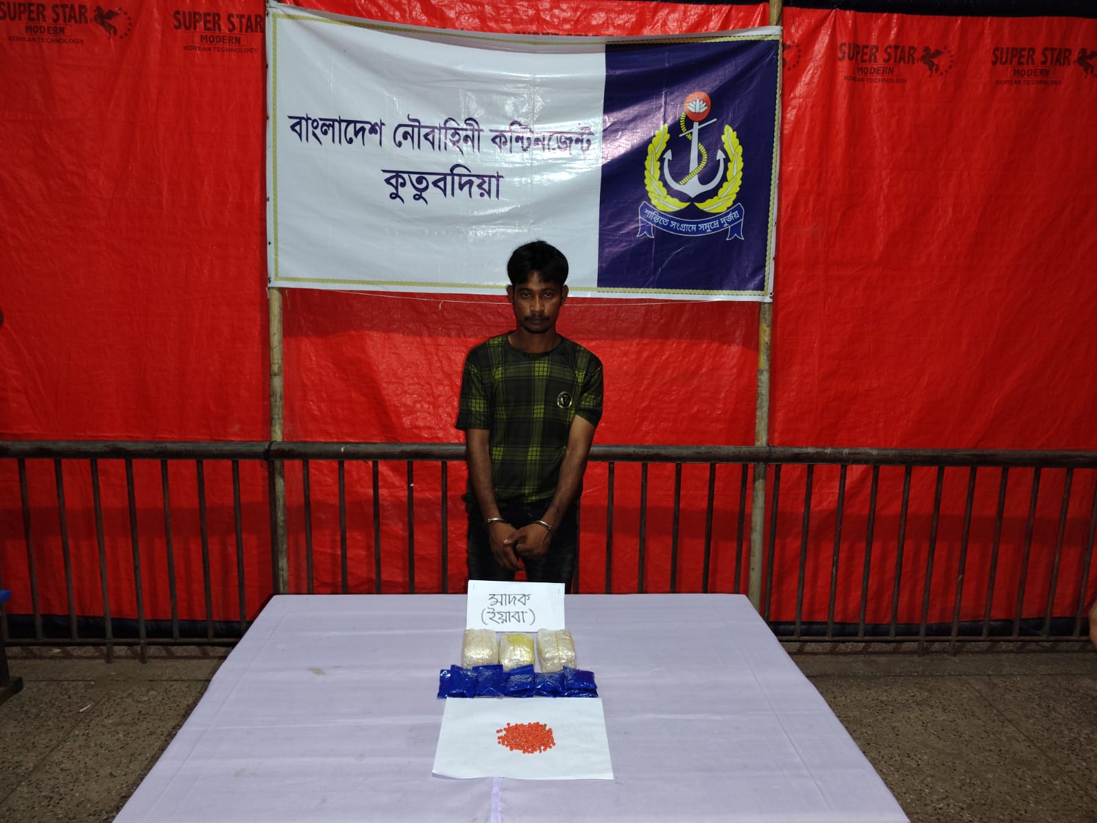 কক্সবাজারের কুতুবদিয়ায় অভিযান পরিচালনা করে বাংলাদেশ নৌবাহিনী ৮৩৫০ পিচ ইয়াবা ট্যাবলেটসহ শামসুল আলম নামক এক মাদক ব্যবসায়ী আটক করা হয়। গোপন তথ্যের ভিত্তিতে কুতুবদিয়া উপজেলার বড়ঘোপ ইউনিয়নের কৈবর্ত্য পাড়া এলাকা থেকে শনিবার সন্ধ্যায় তাকে আটক করা হয়। অভিযানে নৌবাহিনীর সাথে কুতুবদিয়া থানা পুলিশের একটি আভিযানিক দল অংশগ্রহণ করেন। আটককৃত মাদক ব্যবসায়ীকে মাদকসহ পরবর্তী আইনানুগ ব্যবস্থা গ্রহণের জন্য কুতুবদিয়া থানায় হস্তান্তর করা হয়েছে এক প্রেস বিজ্ঞপ্তির মাধ্যমে জানানো হয়েছে।