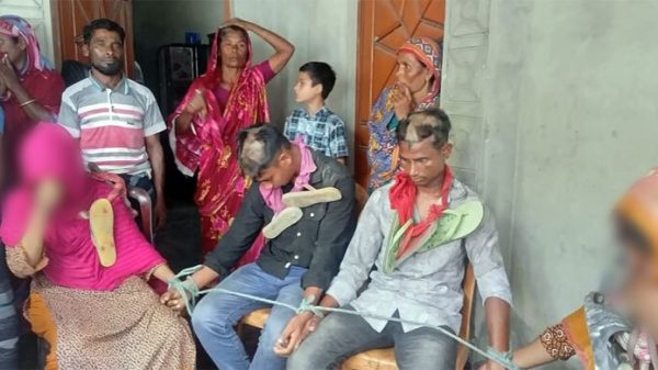 একই বাড়িতে সৌদি প্রবাসী দুই ভাইয়ের স্ত্রীর সঙ্গে রাতের আঁধারে পরকীয়া করতে গিয়ে স্থানীয়দের হাতে ধরা পড়েছেন দুই বন্ধু। পরে একই রশিতে চারজনের হাত বেঁধে ওই দুই বন্ধুর মাথা ন্যাড়া