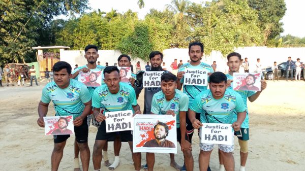 কক্সবাজারের উখিয়ায় ফুটবল খেলার মাঠে ওসমান হাদি হত্যার ঘটনায় জড়িতদের বিচারের দাবিতে প্লেকার্ড প্রদর্শন করেছেন স্থানীয় খেলোয়াড়রা। শুক্রবার (২ জানুয়ারি) বিকেলে রাজাপালং ইউনিয়নের তুতুরবিল খেলার মাঠে খেলা শুরুর আগে খেলোয়াড়রা