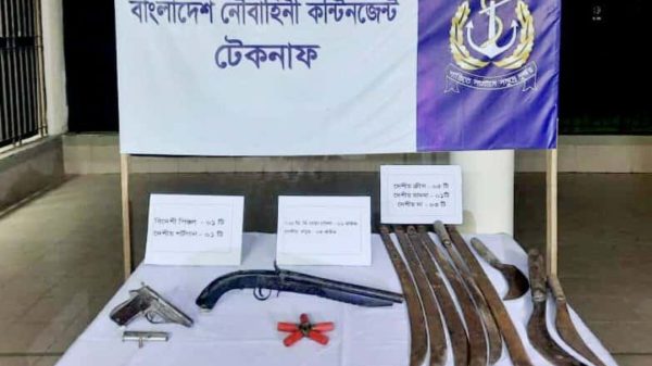 কক্সবাজারের টেকনাফে নৌবাহিনীর বিশেষ অভিযানে বিদেশি পিস্তল, দেশীয় অস্ত্র ও গুলিসহ বিপুল পরিমাণ আগ্নেয়াস্ত্র উদ্ধার করা হয়েছে। শুক্রবার (১০ অক্টোবর) রাতে টেকনাফ সদর ইউনিয়নের মৌলভীপাড়া এলাকায় গোপন সংবাদের ভিত্তিতে এই