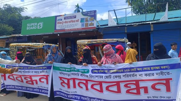 কক্সবাজারের উখিয়ায় ফলিয়াপাড়া সরকারি প্রাথমিক বিদ্যালয় ভোট কেন্দ্র না সরানোর দাবিতে মানববন্ধন করেছে স্থানীয় সাধারণ জনগণ। শনিবার (১৮ অক্টোবর) সকাল ১০টার দিকে উখিয়া দক্ষিণ স্টেশন চত্বরের উখিয়া কেন্দ্রীয় জামে মসজিদের