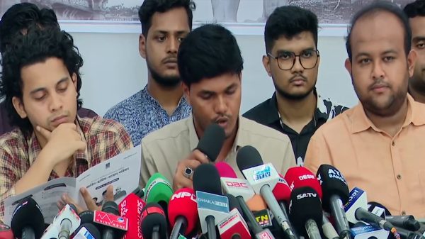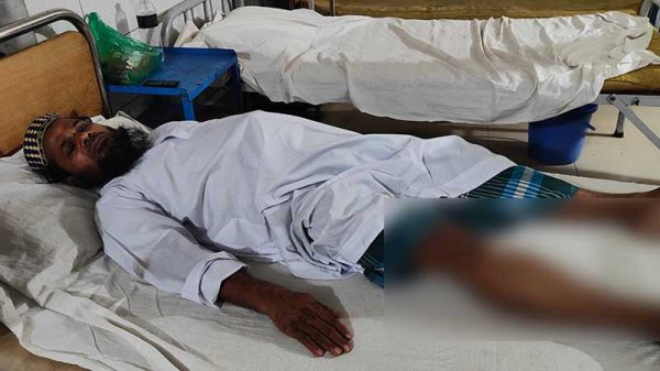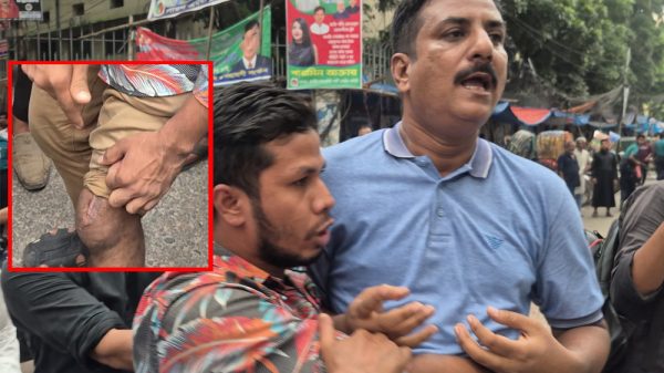 অ্যাশ রঙের গেঞ্জি পরা একজনকে জাপটে ধরে আহত জুলাইযোদ্ধা ইয়াসিন বলেন, ‘উনিই আমার পায়ে ৪ আগস্ট গুলি করেছে। উনাকে আমি ছাড়ব না।’ পাশে থাকা পুলিশকে উদ্দেশ করে তিনি আরো বলেন,