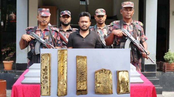 যশোর: পাঁচটি সোনার বারসহ যশোরে একজন পাচারকারীকে গ্রেপ্তার করেছেন বর্ডার গার্ড বাংলাদেশ (বিজিবি) সদস্যরা। বৃহস্পতিবার (১৮ সেপ্টেম্বর) ভোরে শহরতলীর মুড়লি মোড় এলাকা থেকে তাকে গ্রেপ্তার করা হয়। গ্রেপ্তার আবু বকর