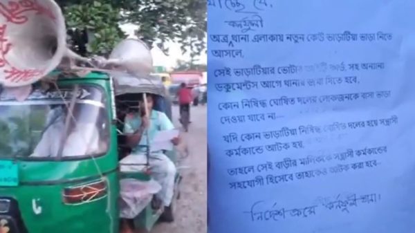 চট্টগ্রামের কর্ণফুলীতে নিষিদ্ধ ঘোষিত দলের লোকজনকে বাসা বা ফ্ল্যাট ভাড়া না দেওয়ার আহ্বান জানিয়ে পুলিশের পক্ষ থেকে মাইকিং করা হয়েছে। বুধবার (১৭ সেপ্টেম্বর) বিকালে এমন একটি ভিডিও সামাজিক যোগাযোগমাধ্যম ফেসবুকে