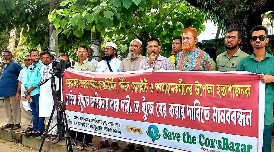 পরিবেশ, জলবায়ু সুরক্ষা ও নাগরিক সংগঠন ‘সেভ দ্য কক্সবাজার’ আয়োজিত এক মানববন্ধনে বক্তারা বলেন, ‘রোহিঙ্গাদের নিরাপদ প্রত্যাবাসন ইস্যুতে দেশের শতকোটি টাকা খরচ করে তিনদিনের আন্তর্জাতিক সম্মেলন হলেও সফলতা নিয়ে আমরা সন্দিহান। কারণ প্রত্যাবাসন বিষয়ে সুনির্দিষ্ট কোনো রোডম্যাপ ঘোষণা করা হয়নি’।